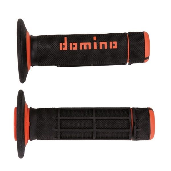 Offroad gripy značky DOMINO s uzavretým koncom majú dĺžku 118 mm a sú vyrobené z dvojzložkovej termoplastickej gumy v kombinácii čiernej a oranžovej farby.