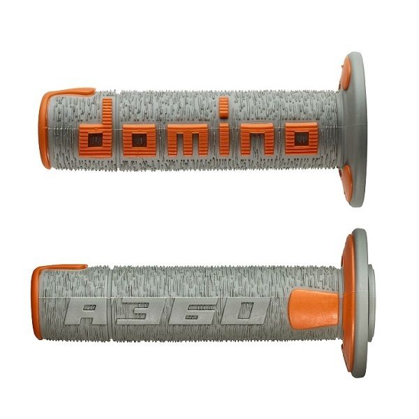 Offroad gripy (A360) značky DOMINO s otvoreným koncom majú dĺžku 120 mm a sú vyrobené z termoplastickej gumy v kombinácii sivej a oranžovej farby.