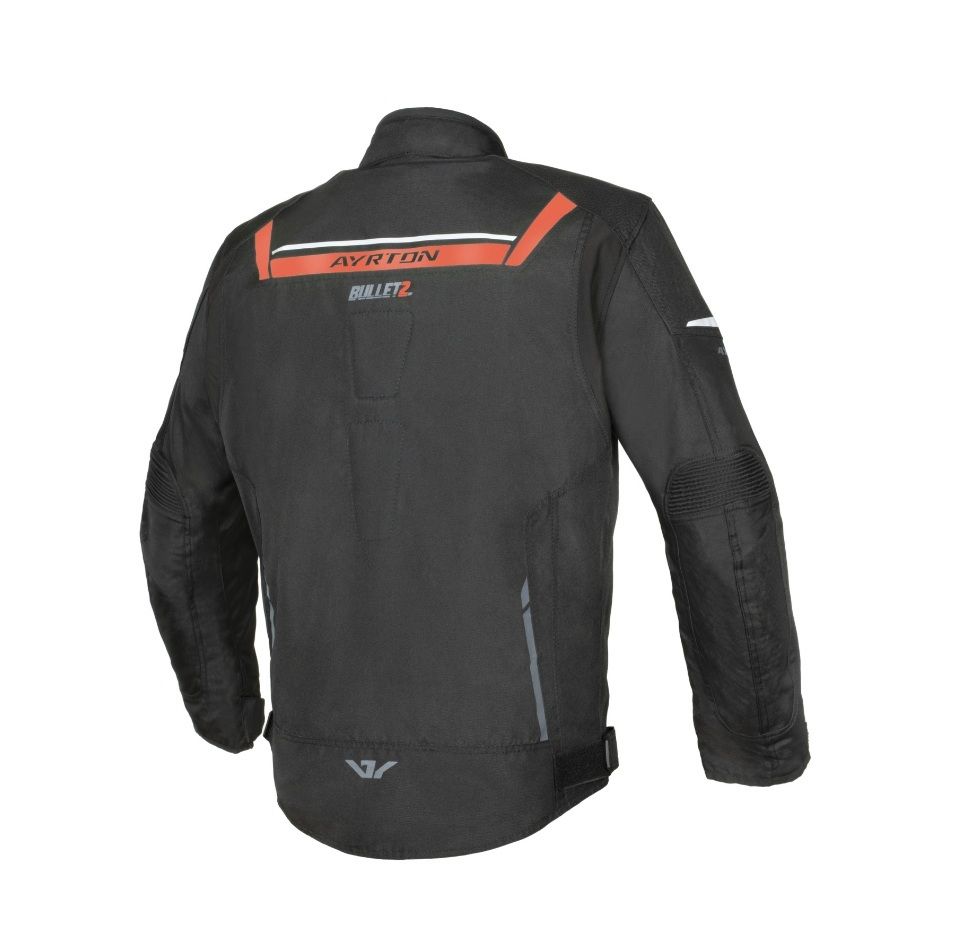 Bunda Bullet značky AYRTON s odnímateľnou termovložkou disponuje obšívkou s čiastočne vodeodolnou úpravou, odnímateľnými chráničmi lakťov a ramien LITE PRO, strečovými panelmi v oblasti lakťov, vreckami a zvýšeným golierom s pútkom na jeho upevnenie v otvorenej polohe a prípravou so zakladačom na umiestnenie hydrobagu. Na bunde je možné nastaviť obvodu spodného lemu, manžiet rukávov a oblasť bicepsov. Vďaka reflexným prvkom je zabezpečená lepšia viditeľnosť. Bundu je možné spojiť s nohavicami pomocou krátkeho zipsu.