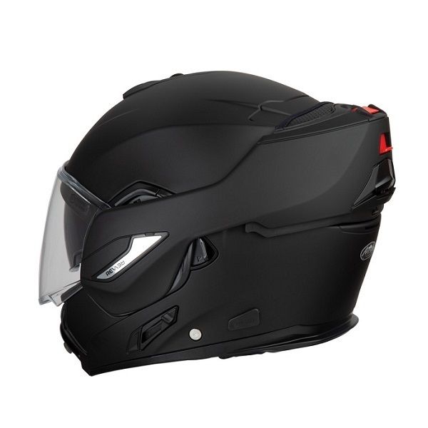 - šróbenie výklopu zaručuje nízku výšku vyklopenej bradovej časti a teda aj menší odpor vetra pri jazde s otvorenou prilbou