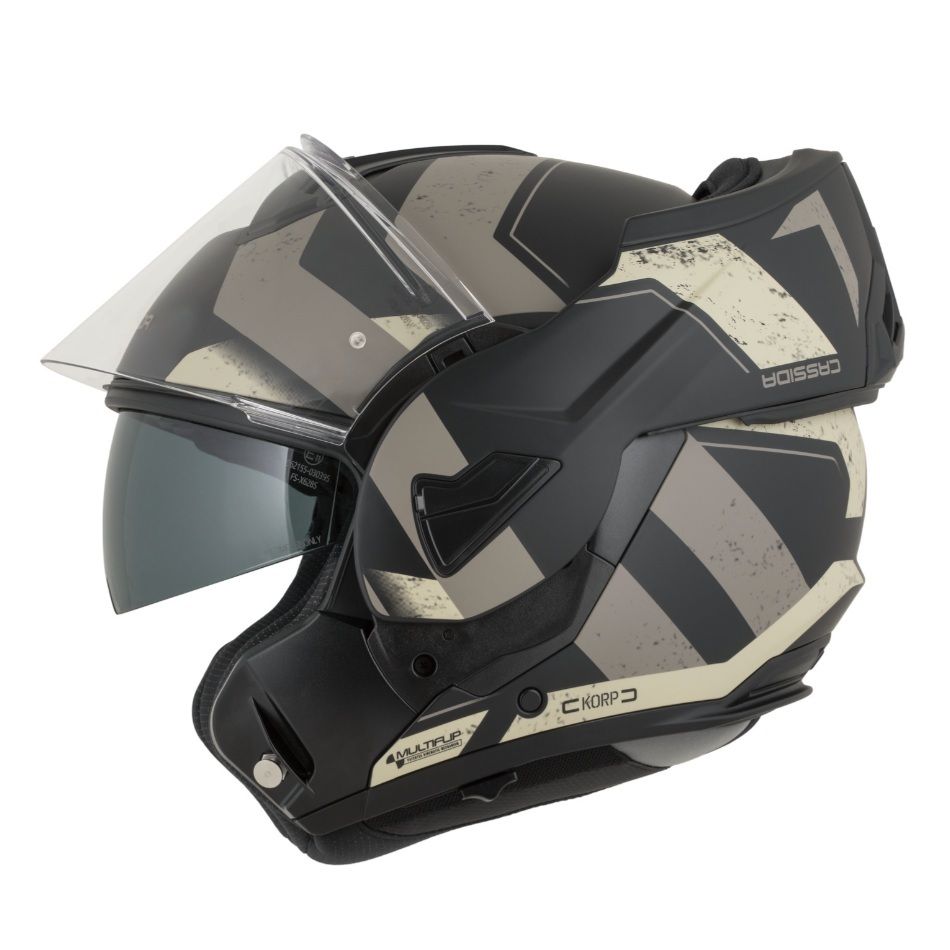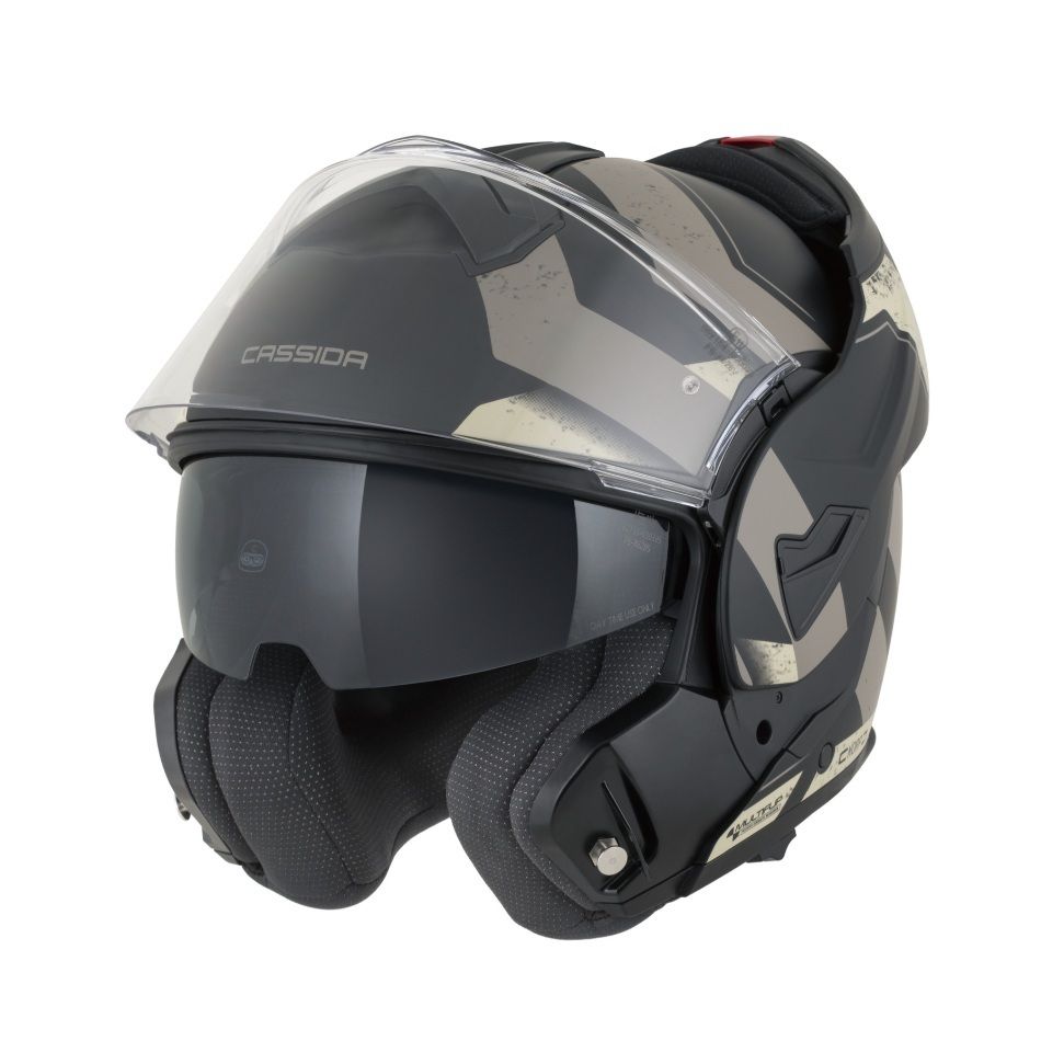 Prilba Multiflip od značky CASSIDA je praktická cestovná výklopná prilba s polykarbonátovou škrupinou, integrovanou slnečnou clonou a účinným odvetraním. Ponúka pohodlný interiér z antibakteriálneho materiálu IONIC+® a priestor na jednoduchú montáž komunikátora. Súčasťou balenia je Pinlock® 70 proti zahmlievaniu aj odnímateľný bradový deflektor. Prilba má široké plexi pre lepší výhľad, mikrometrické zapínanie, interiér prispôsobený použitiu dioptrických okuliarov a reflexné prvky pre zvýšenú bezpečnosť. Vďaka dvojitej homologácii ju možno používať ako integrálnu aj otvorenú prilbu.