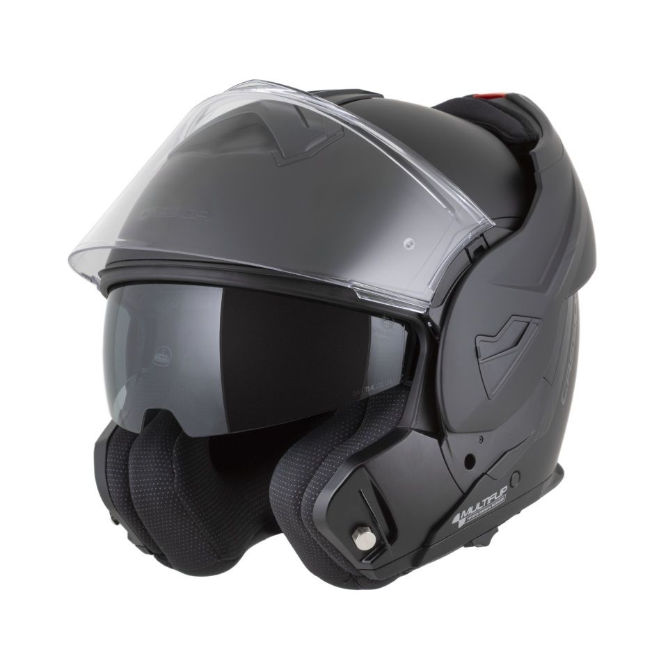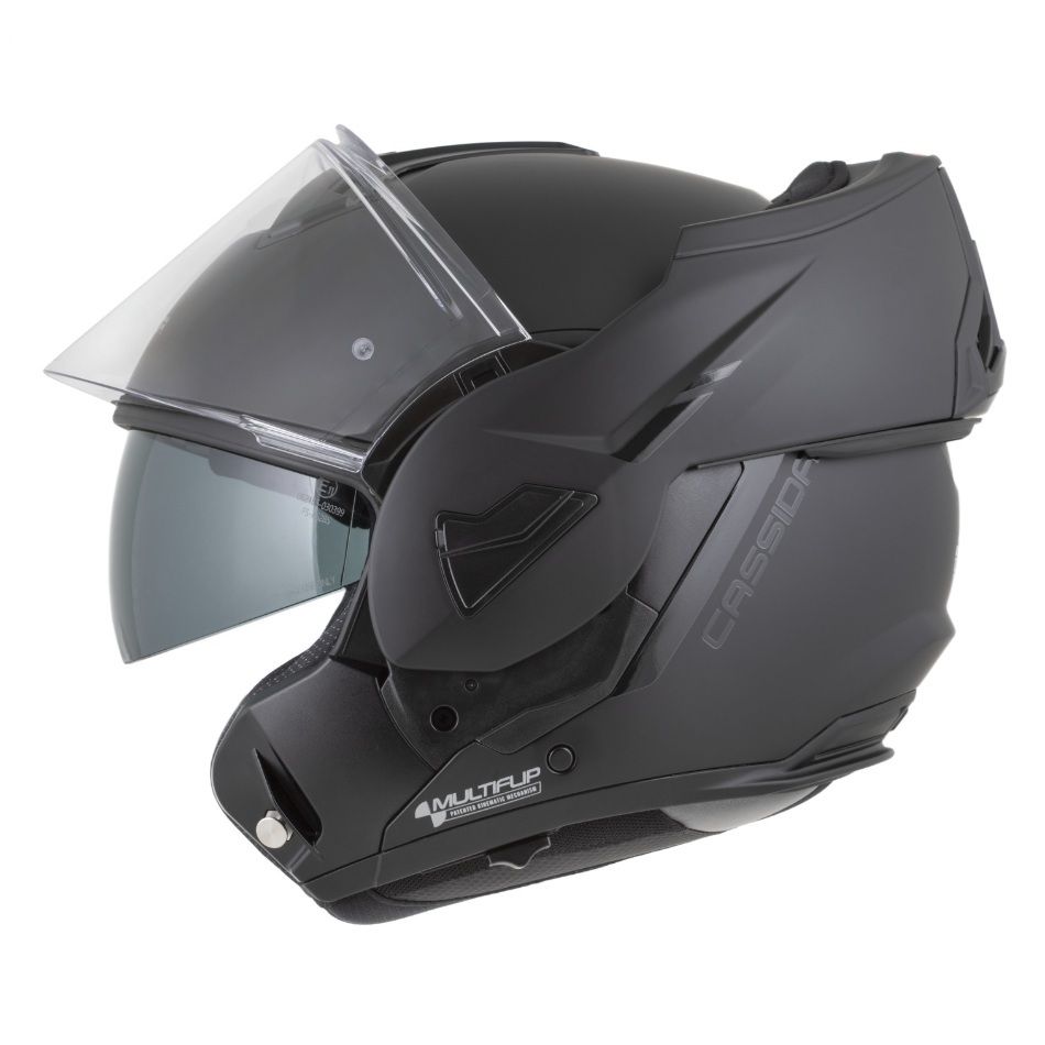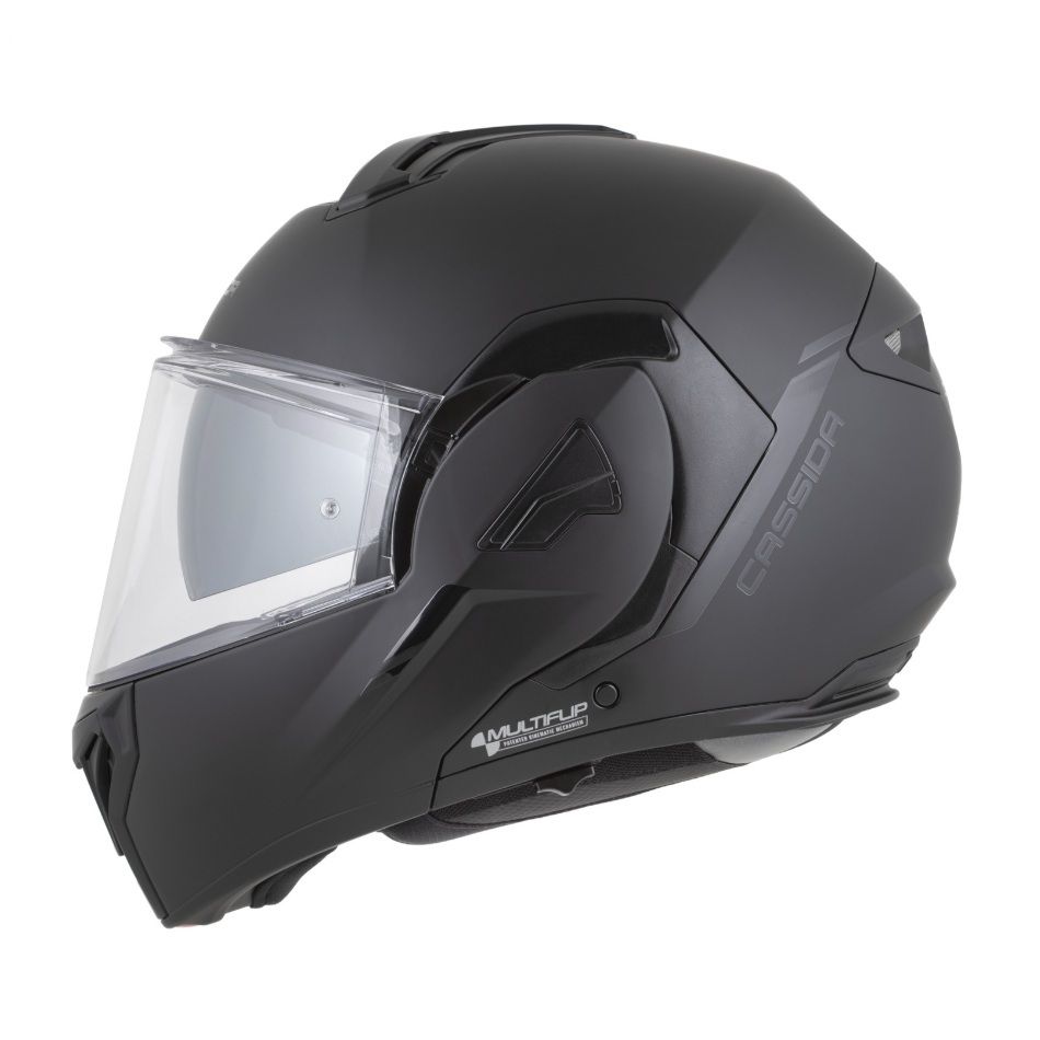 Prilba Multiflip od značky CASSIDA je praktická cestovná výklopná prilba s polykarbonátovou škrupinou, integrovanou slnečnou clonou a účinným odvetraním. Ponúka pohodlný interiér z antibakteriálneho materiálu IONIC+® a priestor na jednoduchú montáž komunikátora. Súčasťou balenia je Pinlock® 70 proti zahmlievaniu aj odnímateľný bradový deflektor. Prilba má široké plexi pre lepší výhľad, mikrometrické zapínanie, interiér prispôsobený použitiu dioptrických okuliarov a reflexné prvky pre zvýšenú bezpečnosť. Vďaka dvojitej homologácii ju možno používať ako integrálnu aj otvorenú prilbu.