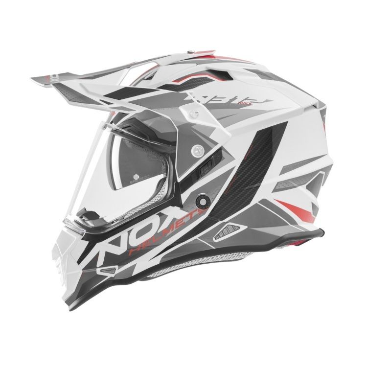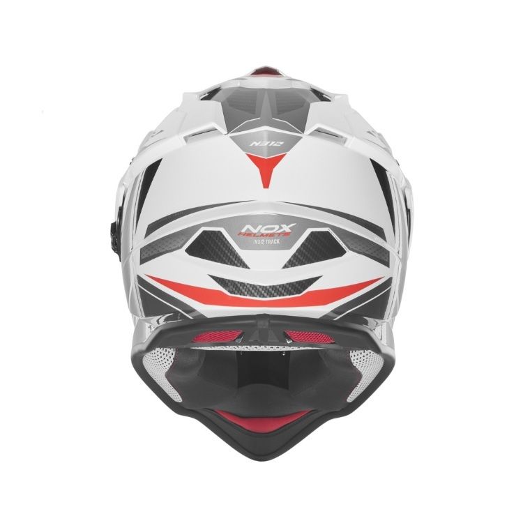 Prilba N312 Track značky NOX má polykarbonátovú škrupinu, plne odnímateľnú a prateľnú výstielku, bradový a nosový deflektor, prípravu pre slúchadlá komunikátorov, interiér prispôsobený použitiu okuliarov, číre plexi s prípravou pre Pinlock® fóliu a povrchovou úpravou proti poškriabaniu a integrovanú slnečnú clonu. Tvar spodnej časti škrupiny je optimalizovaný ako čiastočná náhrada chrániča krku. Prilba je homologizovaná normou ECE 22.06, disponuje odnímateľným šiltom, viacerými ventiláciami a bezpečnostným zapínaním remienku pomocou mikrometrickej pracky.