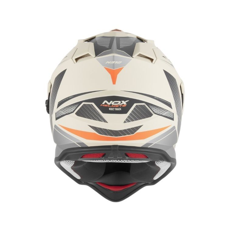 Prilba N312 Track značky NOX má polykarbonátovú škrupinu, plne odnímateľnú a prateľnú výstielku, bradový a nosový deflektor, prípravu pre slúchadlá komunikátorov, interiér prispôsobený použitiu okuliarov, číre plexi s prípravou pre Pinlock® fóliu a povrchovou úpravou proti poškriabaniu a integrovanú slnečnú clonu. Tvar spodnej časti škrupiny je optimalizovaný ako čiastočná náhrada chrániča krku. Prilba je homologizovaná normou ECE 22.06, disponuje odnímateľným šiltom, viacerými ventiláciami a bezpečnostným zapínaním remienku pomocou mikrometrickej pracky.