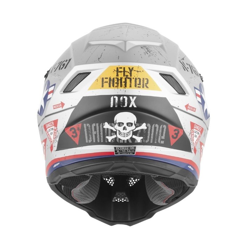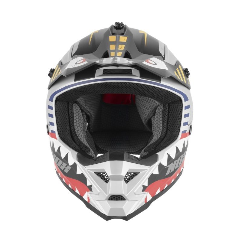 Prilba N761 MX značky NOX je detská motocrossová prilba homologizovaná normou 22.06, prilba je vybavená polykarbonátovou škrupinou, plne odnímateľným komfortným interiérom, odnímateľným nosným a bradovým deflektorom a praktickým zapínaním na mikrometrickú pracku. Tvar goliera je optimalizovaný pre použitie chrániča krčnej chrbtice, šilt je nastaviteľný a ventilačný systém poskytuje optimálne prúdenie vzduchu.