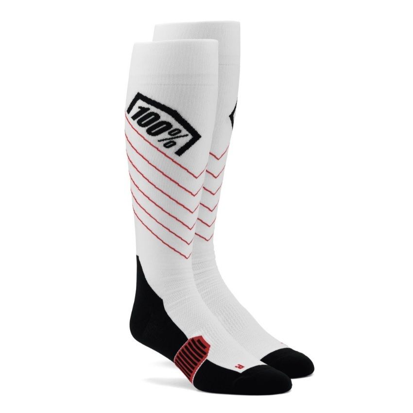 Ponožky HI SIDE MX značky 100% boli navrhnuté pre špičkových jazdcov, sú kombináciou funkčnej textílie so sieťovinovými kanálikmi pre dostatočnú ventiláciu, kompresným oblúkom v oblasti priehlavku a strategickým polstrovaním v oblasti päty a špičky. Ponožky sú vyrobené z Cool-Max strečovej tkaniny, ktorá výborne odvádza vlhkosť, majú ľahkú, tenkú konštrukciu, štýlový dizajn a dĺžku po kolená (To-The-Knee).