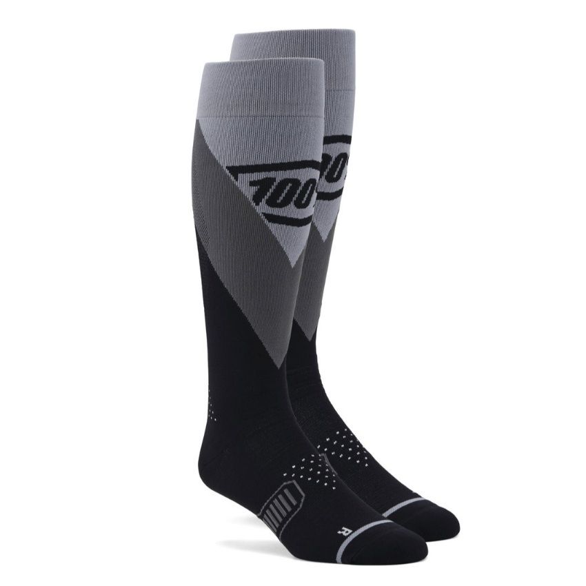 Ponožky HI SIDE MX značky 100% boli navrhnuté pre špičkových jazdcov, sú kombináciou funkčnej textílie so sieťovinovými kanálikmi pre dostatočnú ventiláciu, kompresným oblúkom v oblasti priehlavku a strategickým polstrovaním v oblasti päty a špičky. Ponožky sú vyrobené z Cool-Max strečovej tkaniny, ktorá výborne odvádza vlhkosť, majú ľahkú, tenkú konštrukciu, štýlový dizajn a dĺžku po kolená (To-The-Knee).