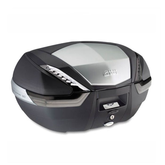 Vrchný kufor Monokey V47NT značky GIVI s čírymi odrazkami a čiastočne hliníkovým vekom má vnútorný objem 47 litrov a nosnosť 10kg. Umožňuje uskladnenie dvoch integrálnych prilieb. Kufor obsahuje vstavaný priestor na dokumenty a praktické madlo pre uľahčenie prenášania kufra, systém uchytenia kufra: Monokey.