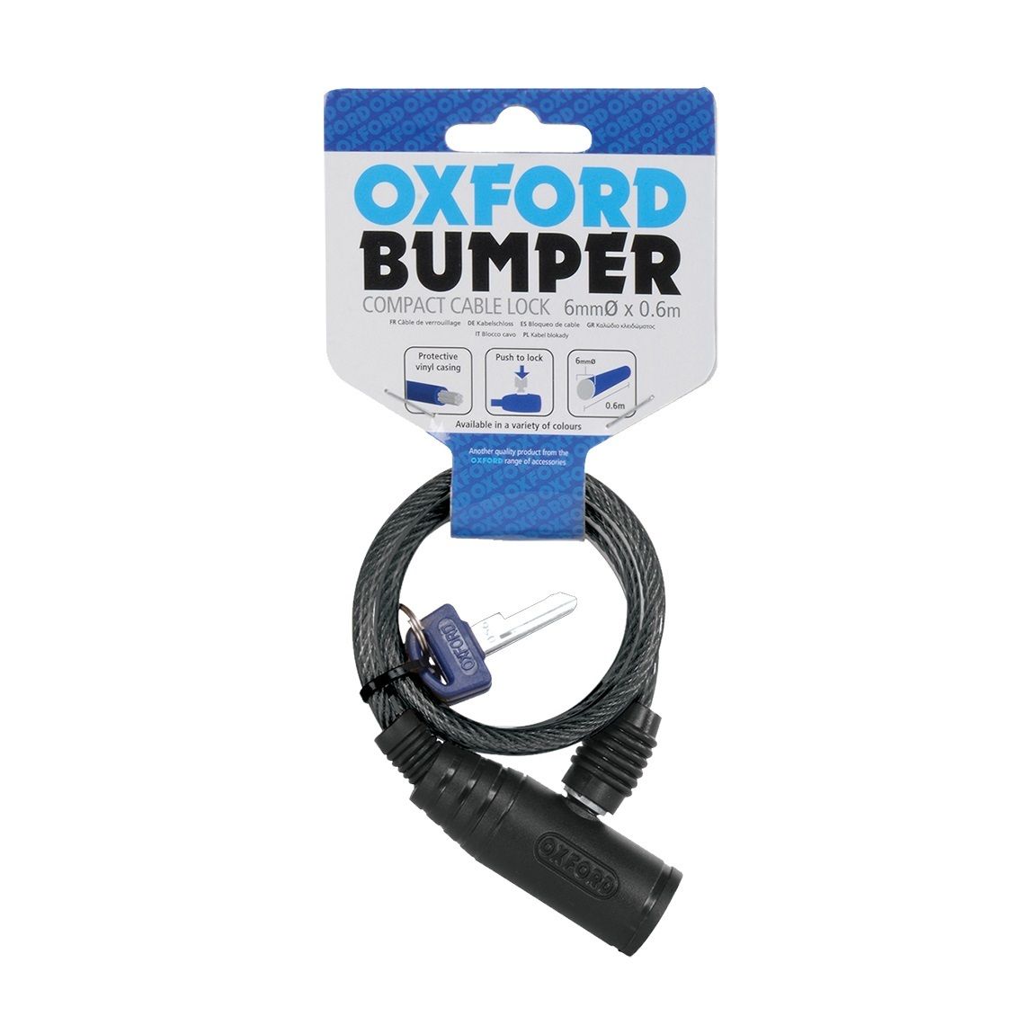 Zámok na motocykel Bumper Cable Lock v dymovej farbe a s dĺžkou 0,6 m značky OXFORD obsahuje sadu vrátane dvoch kľúčov. Jadro je tvorené z predpätého oceľového kábla s priemerom 6 mm s vinylovým plášťom.