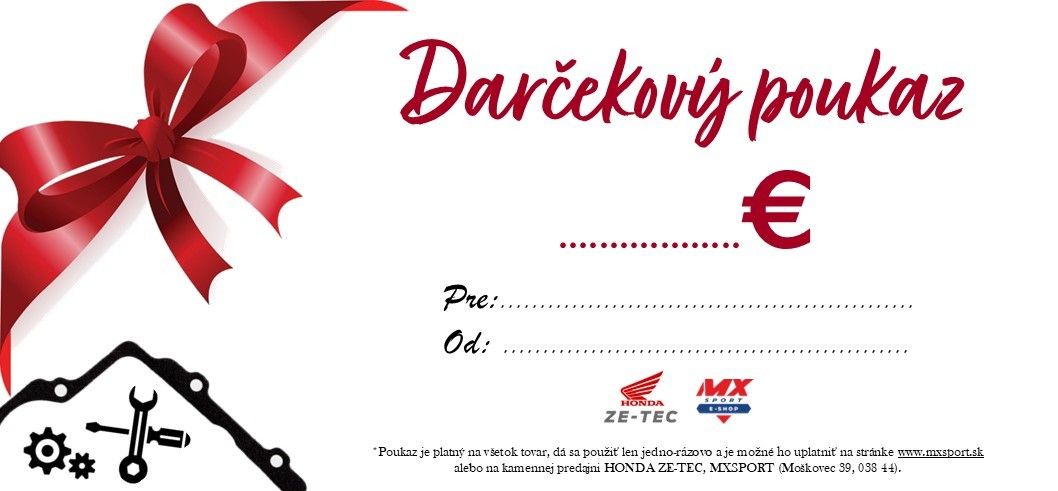 Našimi darčekovými poukážkami si môžete byť istí, že potešíte – je to darček, ktorý sa nestratí a obdarovaný ho môže využiť kedykoľvek počas roka. Po objednaní a zaplatení zasielame poukážku poštou spolu s kódom a v prípade záujmu aj s venovaním. Kód si uplatní obdarovaná osoba jeho zadaním do objednávky, ktorú zrealizuje na našom eshope. Darčeková poukážka je platná na všetok tovar, dá sa použiť len jednorázovo a je možné ju uplatniť len na e-shope www.mxsport.sk / www.mx-sport.sk alebo v kamennej predajni MXSPORT.